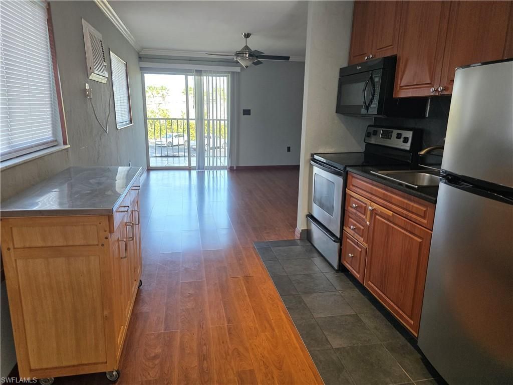 Fresh and smartly appointed studio style unit with screened balcony for a peaceful feeling. Luxury vinyl floors, designer ceiling fans, upgraded kitchen with stainless steel appliances, large double closet, laundry just steps away downstairs. Highly desirable location at Summerlin and Gladiolus with everything you need nearby including Lakes Park, public library, shopping, dining, entertainment, and just minutes to the beach!